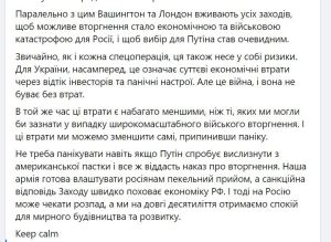 “Like any special operation, this one carries risks. For Ukraine, first of all, it means significant economic losses due to the outflow of investors and panic. But this is a war, and it is not without losses. At the same time, these losses are much smaller than we could have suffered in the event of a large-scale military invasion. And we can reduce these losses ourselves by stopping the panic”.