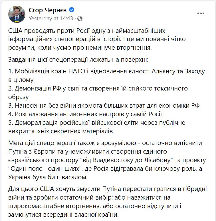 Yegor Chernev, a Ukrainian MP for the People’s Servant, president Zelensky’s party, and leader of delegation to the NATO Parliamentary Assembly today commented that “the US is conducting against Russia one of the biggest special operation in history”.